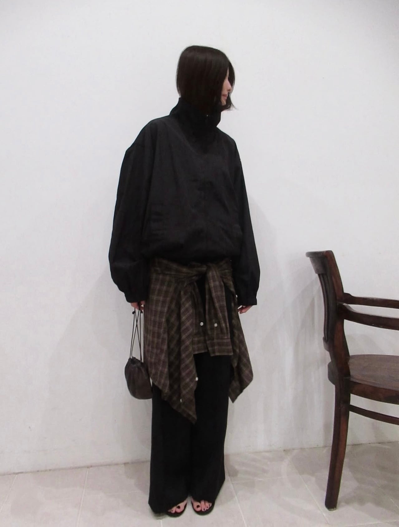 程よい通気性で夏にも大活躍し、屋外ではTシャツxウエストコーデ、室内の冷房が冷える時はさっと羽織れるのも重宝します。秋冬にはVネックニットやタートルニット合わせで襟元を華やかに、オーバーサイズのレザーJKにも相性◎です。