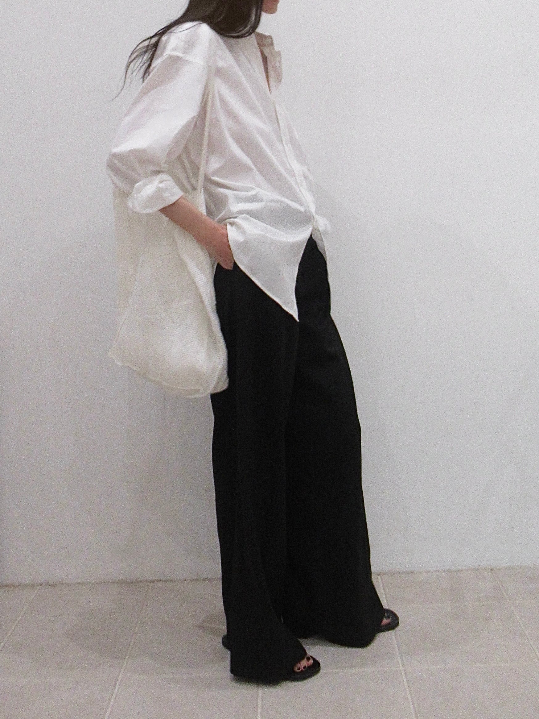 落ち着いたワイドシルエットに、丈が長すぎないトレンドのシルエット。袖はややボリュームスリーブになっておりドレープ感が際立ちます。